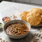 Chole bhature is the Punjabi street food combination of spicy, tangy chickpea curry paired with puffy fried bread that balloons up in hot oil. It is indulgent, filling, and one of the most satisfying meals in the Indian repertoire. This simplified version uses canned chickpeas and a quick yeasted dough to get you to the same place without an overnight soak or a complicated fermentation.