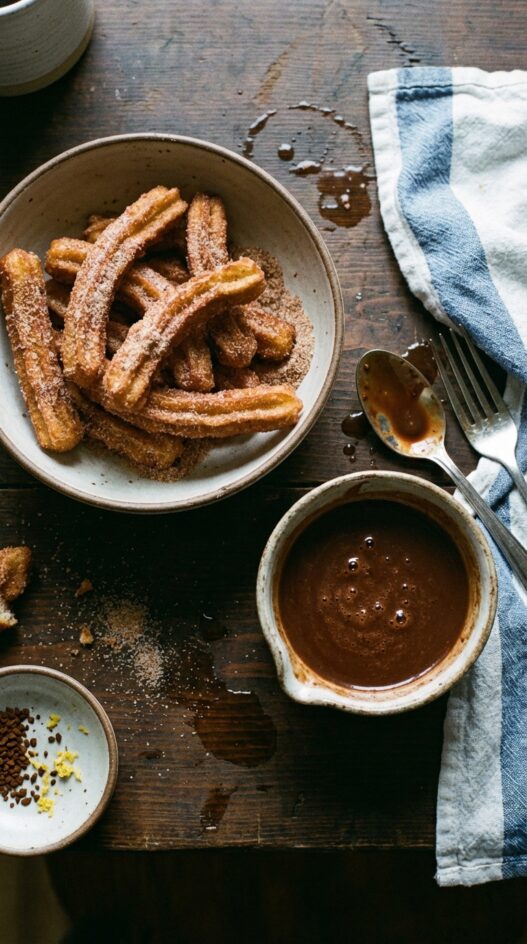 Churros are worth the hot oil and the mess. You get a batch of crispy, cinnamon-sugar coated pastry that takes maybe forty minutes start to finish, and the chocolate coffee sauce takes five more. The sauce is what makes this worth doing at home rather than buying them from a stand: dark chocolate, a small hit of instant coffee, and heavy cream, pulled together into something thick enough to coat the back of a spoon. Make these for a dinner party or on a Sunday afternoon when nobody has anywhere to be.