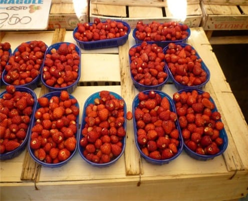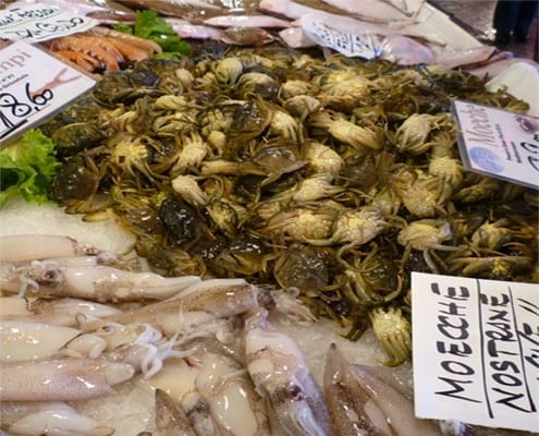 On any day trip to Venice with Italiaoutdoors Food and Wine, our food loving guests are treated to a visit to Venice’s famed Rialto market. We cross the famous bridge, and enter first into the multitude of fresh produce stands, displaying a stunning variety of fresh fruits and vegetables. Our guests are amazed by the selection, often purchasing a little to taste and share with the others – fresh wild strawberries were the favorite on our last trip. We Americans want to pick them up and touch them, but don’t! The Italian shopkeepers will reprimand you, and place them in a bag for you.