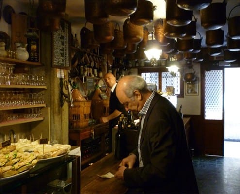 The perfect post-market snack, and the meeting place for the locals after they finish their shopping for the day, are the small traditional wine bars that are located within a few blocks of the market. Serving little snacks called cicchetti or cichetti , similar to the Spanish tapas, these snacks will feature many of the wonderful seasonal foods you just admired in the market. A walking tour of the wine bars is a great end to the morning; called a giro d’ombra, or tour of shadows, as ombra is local slang for a glass of wine.