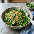 A vibrant cilantro salad with crunchy snap peas, toasted peanuts, and crispy shallots. Delicious on its own or as a topping for rice or fish.