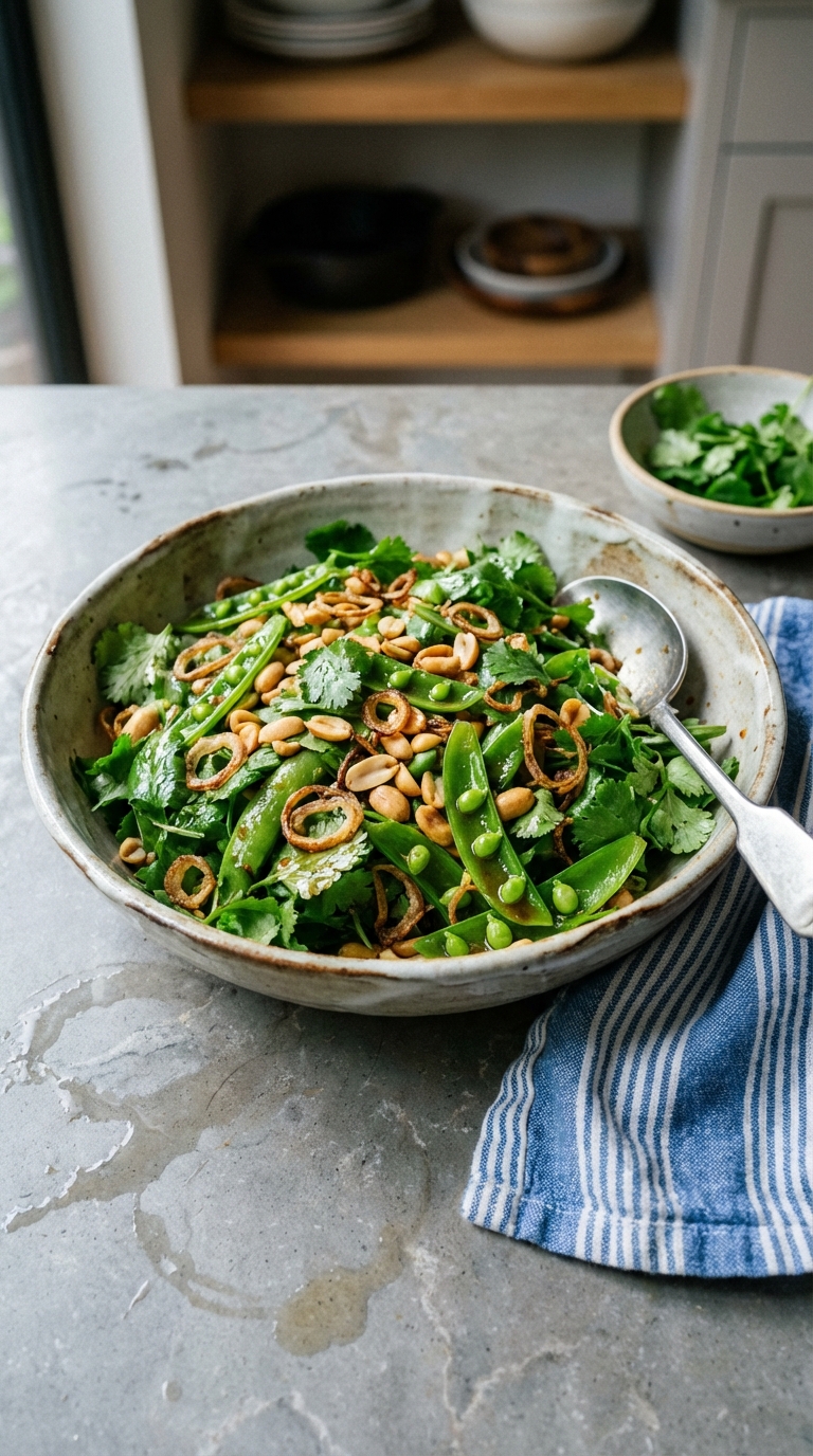 Cilantro and Snap Pea Salad with Toasted Peanuts and Fried Shallots