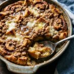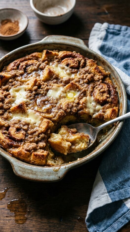 Sweet cinnamon rolls and fluffy bread soak in a creamy custard, topped with crunchy streusel. A comforting brunch treat.