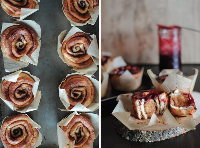 For a rustic presentation, pack each cinnamon bun individually in parchment paper. You can use fresh or frozen berries for the glaze. Store leftover buns in an airtight container at room temperature for up to 2 days. Reheat before serving for best results.