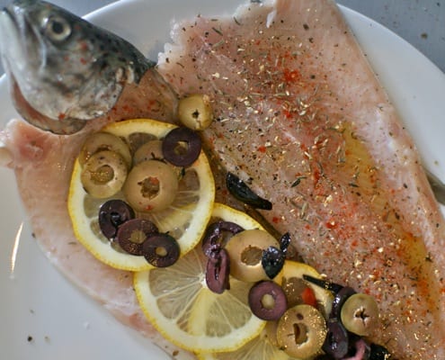 - On a large baking sheet lined with foil, open all three butterflied trout, skin side down, and season the insides with salt and pepper, cayenne and oregano. Drizzle a bit of olive oil onto each fish. Slightly overlap lemon slices on each filet, so that at least 3-4 fit on each. Divide your olives and portion an even amount on top of the lemon slices.