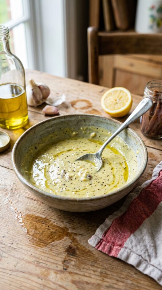 Pulse the garlic and anchovies together first until they form a rough paste. This ensures even distribution through the finished dressing. If you’re anchovy-averse, a teaspoon of fish sauce does similar work without the texture issue.