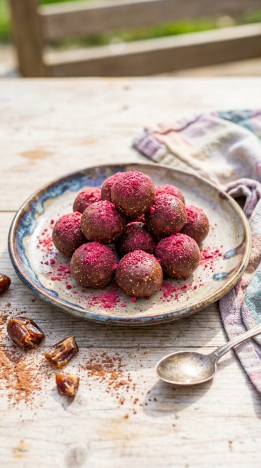 Dates, tahini, cocoa, and freeze-dried raspberries. No baking required, no tempering, no special equipment at all. Easy fix. You blend everything, chill it, and roll it in raspberry powder. The raspberry coating is sharp against the earthy, caramel-thick interior, and that contrast is what makes these interesting rather than just sweet. Chill the mixture for at least an hour before rolling or it won’t hold its shape.