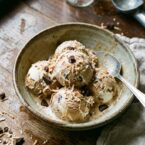 I know the combo of coffee and coconut might seem a little strange but seriously – TRUST ME on this one. It’s delicious! The ice cream itself has both strong coffee and coconut extract along with shredded coconut to amp up the coconut flavor. Then I threw in some chopped up chocolate because you can never go wrong with chocolate, am I right? Side note: I prefer chopping chocolate so it is more flaked rather than adding chocolate chips to chocolate because I can’t stand biting into cold chocolate. But that’s just me so you can add chocolate chips or chunks – whatever you prefer!