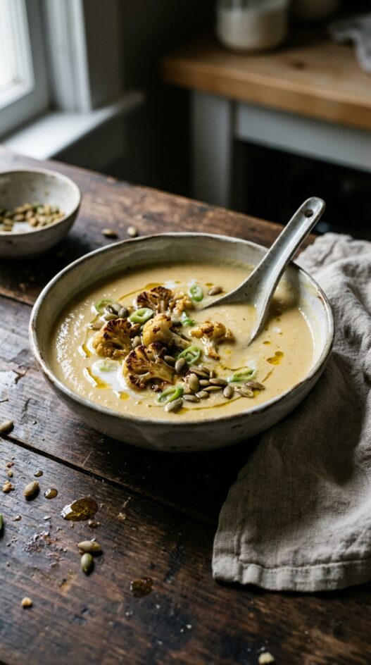 - Ladle soup into bowls and garnish with reserved roasted cauliflower, sliced green scallions, and pepitas (optional).