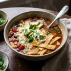 The tortilla strips are lightly baked with minimal olive oil and a small pinch of sea salt. You can just top your soup with the baked tortilla chips but I’m obsessed with adding some to the bottom of the bowl and pouring the soup over the strips. They become slightly soft and add a wonderful texture to the soup. I also always use fire roasted tomatoes with this soup. It lends so much flavor and richness. If you don’t like the whole tomatoes in your soup I often put the tomatoes in a food processor and slightly pulse them to crush. Print