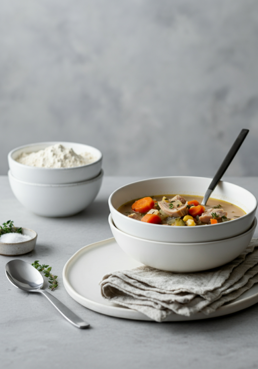 A comforting twist on pot pie! Hearty turkey and veggies in a creamy broth, topped with flaky pie crusts.