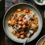 - Add the cooked linguine to the pans and toss with the sauce. If needed, add a few tablespoons of the reserved pasta water to help the sauce cling to the pasta.