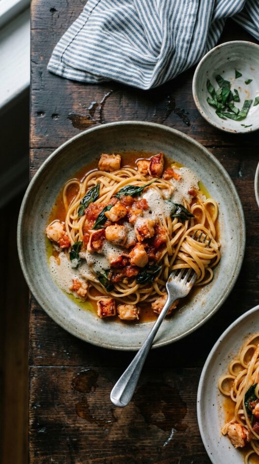 - Plate the linguine, ensuring an even distribution of lobster pieces.