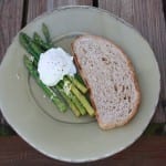 A light meal of fresh asparagus topped with poached eggs and served with toast