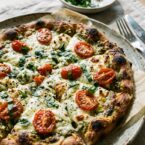 We loved this white pesto pizza, a take on caprese salad with its tomato, basil, and mozzarella components. The dollops of ricotta add some extra cheesy creaminess. If you don’t like ricotta, chunks of goat cheese would be similarly divine on there! I made my own pesto, but you can also use the store-bought stuff…just make sure to clearly specify if you ask three males to pick it up for you, lest they come home with alfredo sauce or something ;) Print