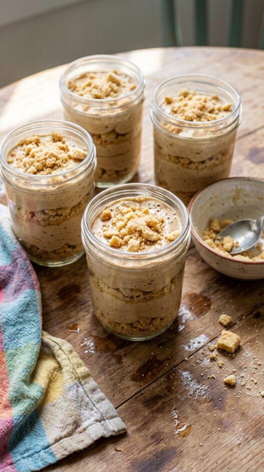 - In four 1-cup jars, add 2 tablespoons of shortbread crumbs to each.
