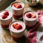 - Fill the glasses with the strawberry mousse and decorate with one strawberry cut in half.