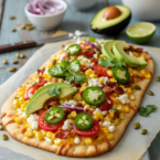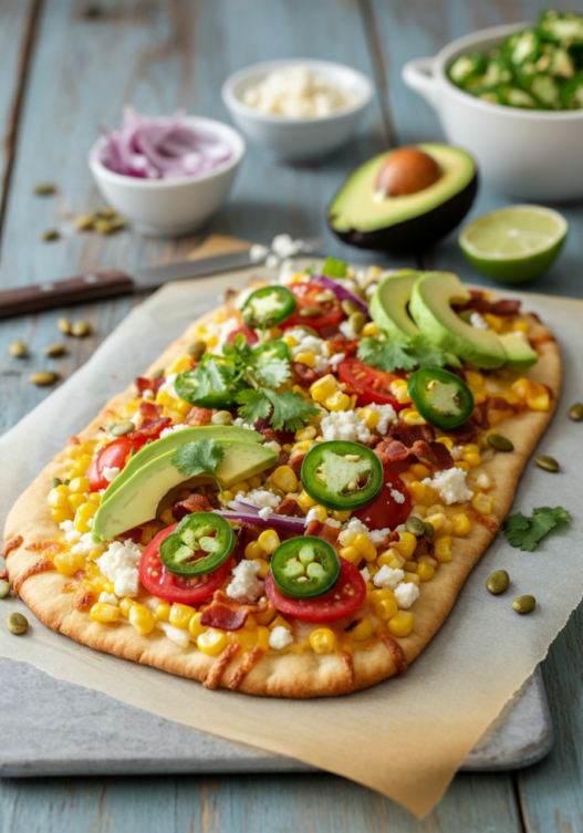 Crispy naan flatbread topped with cheesy goodness, charred corn, smoky bacon, and spicy jalapeños. A quick and satisfying weeknight meal.