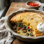 Savory cornbread topping baked over a hearty beef and spinach filling. A hearty and satisfying weekend breakfast.