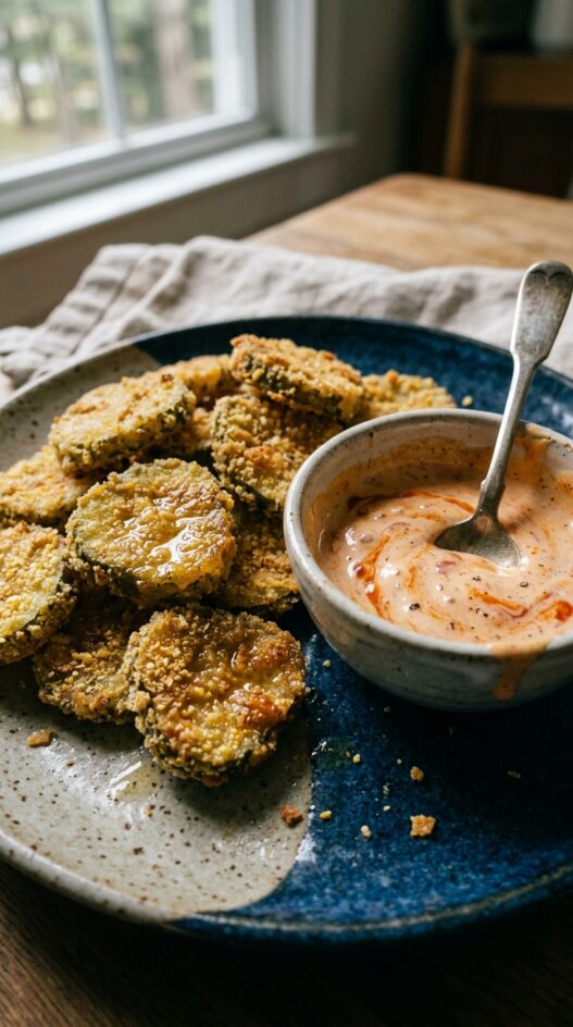 Cornmeal Crusted Fried Pickles with Spicy Dipping Sauce
