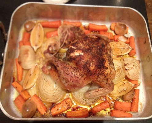 After spending an hour pouring through recipes in cookbooks and on websites, a light bulb lit up in my head: the perfect roasted chicken can’t be that hard to make. I put away the cookbooks, switched off my iPad, and retreated to the kitchen with a massive craving and a smorgasbord of ideas in my head. Like magic, a few hours later, I removed a flawless roasted chicken from the oven. It was crispy on the outside, juicy on the inside, and complete with a satisfying, peppery kick that kept me warm and toasty for the rest of the evening. Print