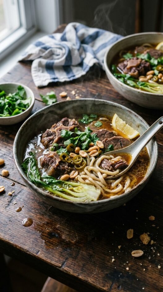Hearty oxtail and beef simmered to perfection in a rich broth, topped with fresh noodles and vibrant garnishes. A cozy meal for chilly evenings.