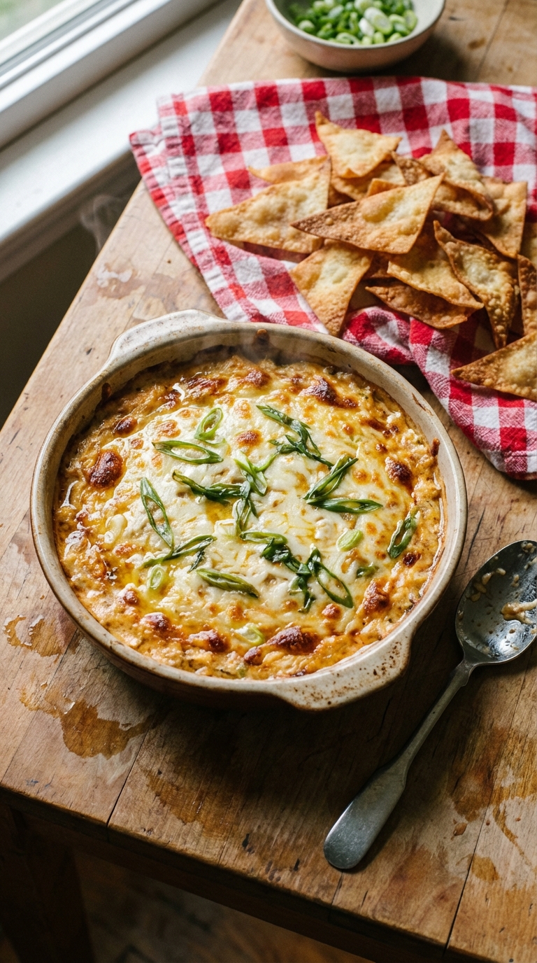 Creamy crab dip with crispy wonton chips. Perfect for parties or a fun weeknight snack!