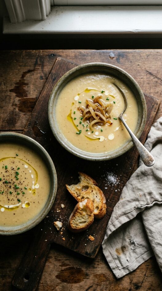 I spent an afternoon in a friend’s kitchen in Paris watching her make this soup. She sliced two pounds of yellow onions paper-thin, buried them in olive oil with thyme, garlic, and a bay leaf, and cooked them over the lowest possible heat for an hour. Not caramelised. Confit. Soft, sweet, translucent, and swimming in oil. Then chicken broth, heavy cream, thirty minutes of simmering, and a blender until smooth.