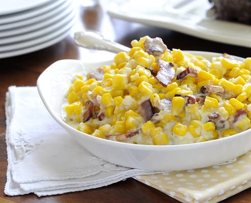 I have always been a huge fan of corn and this dish is by far my favorite corn dish. I used to make this without bacon, but then we all know that bacon makes everything taste that much better. I like this recipe best cooked in a slow cooker for a few hours verses heating it up on the stove top. In the slow cooker it gets nice and creamy and the corn has a chance to drink in the flavors of the parmesan and cream cheese. Leftovers, if there are any, are the best. The parmesan really shines the next day along with the smokiness of the bacon. A simple side dish of corn turned into a gourmet treat for your family.