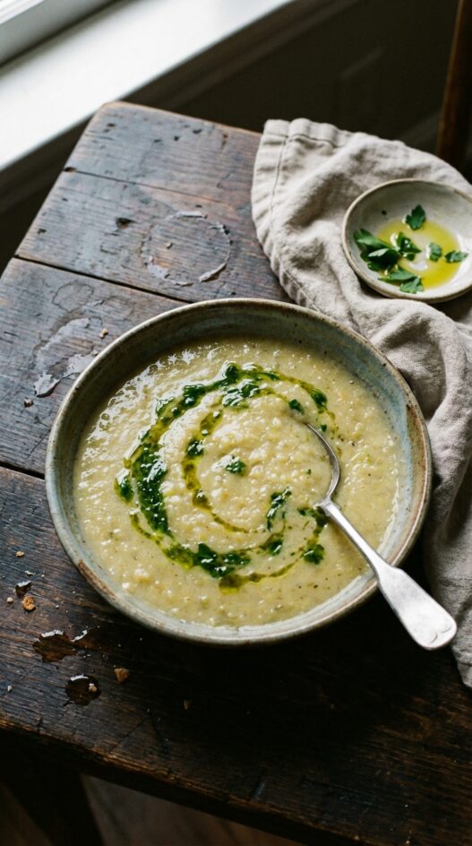 Blend a handful of flat-leaf parsley with olive oil until smooth, then strain. A tablespoon swirled into each bowl just before serving. Bright green, slightly bitter. Do not skip it.