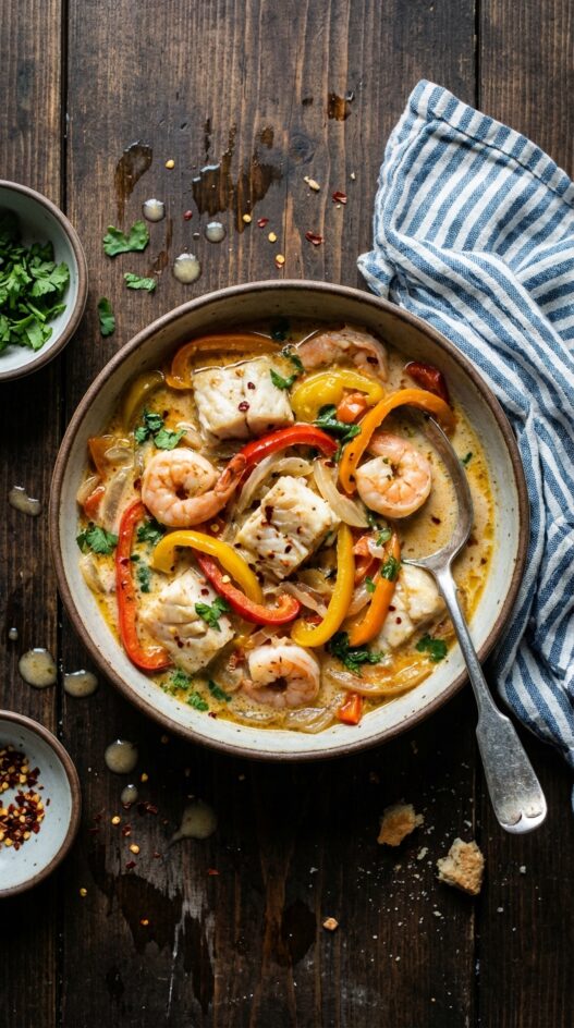 Build the coconut broth and aromatics first, then add the seafood in stages based on cooking time. Shellfish and dense fish go in first, followed by shrimp and flaky fish in the final minutes.