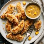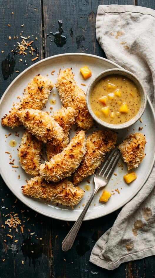 Crispy Coconut Chicken Tenders with Peach Honey Mustard