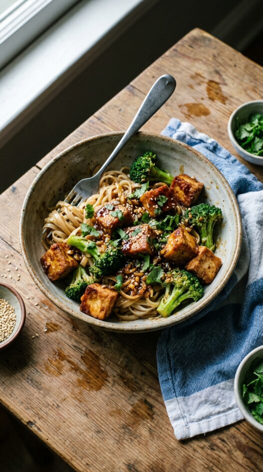 Crispy tofu and broccoli atop rice noodles, tossed in a spicy hoisin sauce. A quick, flavorful weeknight meal.