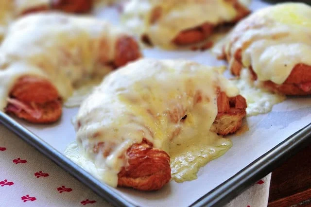 - Place the sandwiches on the prepared baking sheet. Spoon the béchamel sauce over the top of each sandwich, then sprinkle with the remaining Gruyere cheese.