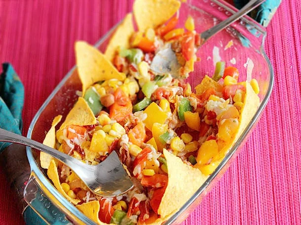 - Serve and enjoy the crunchy cheesy Mexican salad with lots of veggies, beans and Nachos?!