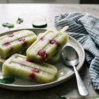 Cantaloupe and cucumber blended together with lemon and mint. Frozen in molds. Simple as that. Persian cucumbers blend smoother than English cucumbers and don’t leave a vegetal aftertaste. The raspberries go in after filling, pushed down into the molds so they’re distributed rather than sitting on top. Agave instead of sugar keeps the sweetness clean. Best in peak summer when cantaloupe is at full ripeness.