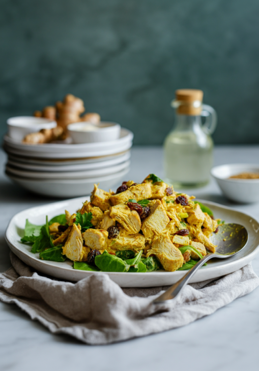 Chicken salad has a reputation problem. Most versions are mayonnaise delivery systems with a few shredded pieces of poultry lost somewhere in there, and the curry ones are often the worst offenders: too sweet, too yellow, no real spice depth. This version fixes that. You cook down onion, ginger, and garlic in oil before the curry goes in, which means the spice blooms properly instead of sitting raw on top of everything. The lime and honey are not afterthoughts; they sharpen the whole thing into something that actually tastes intentional. Use real roasted chicken, not rotisserie if you can help it, and leave some texture in the shreds. I’d eat this on toast, on crackers, on lettuce cups, or honestly standing over the bowl with a fork. It’s a lunch that doesn’t apologize for itself, and in a sea of timid chicken salads, that counts for a lot.