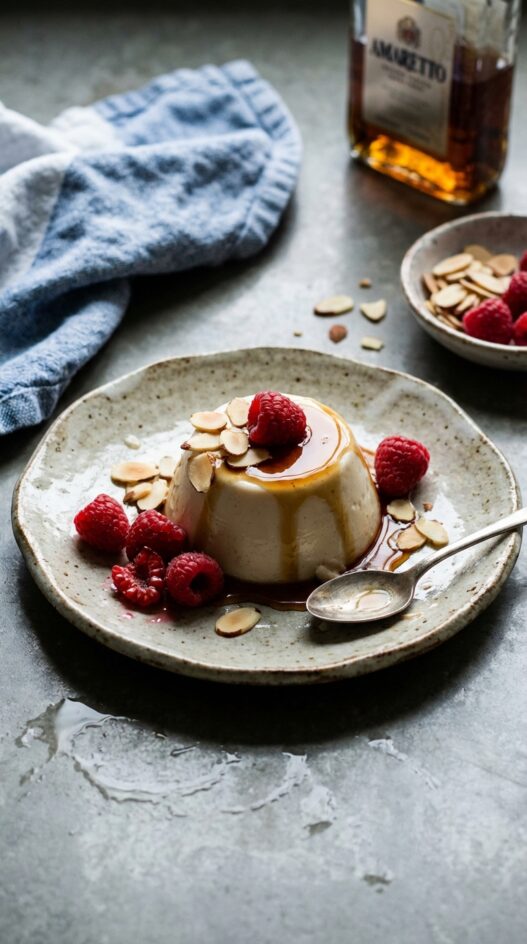 - Drizzle approximately one teaspoon of amaretto over each panna cotta.