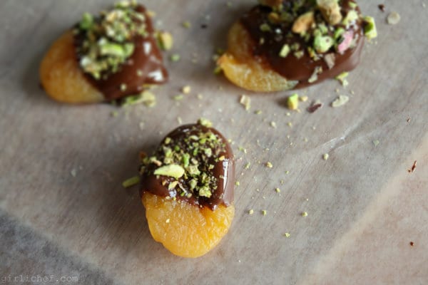 Along the same lines of scrummy chocolate studded with goodies are goodies bathed in scrummy chocolate. Like these plump little nuggets of sunshine. They go swimming in a pool of lightly sweet dark chocolate. Then they take a roll in salty shards of nuttiness. As far as desserts go, I consider them virtuous.