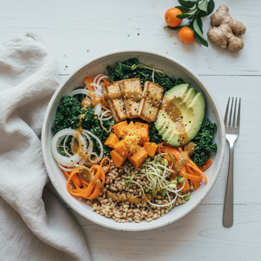 Hearty grains, vibrant veggies, and a tangy miso dressing make this bowl a satisfying and healthy meal. Perfect for a quick weeknight dinner or a light lunch.