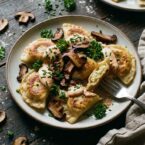 - Spread crema on a plate, top with seared pierogi, sautéed bacon mushrooms, sliced scallions, and curly parsley.