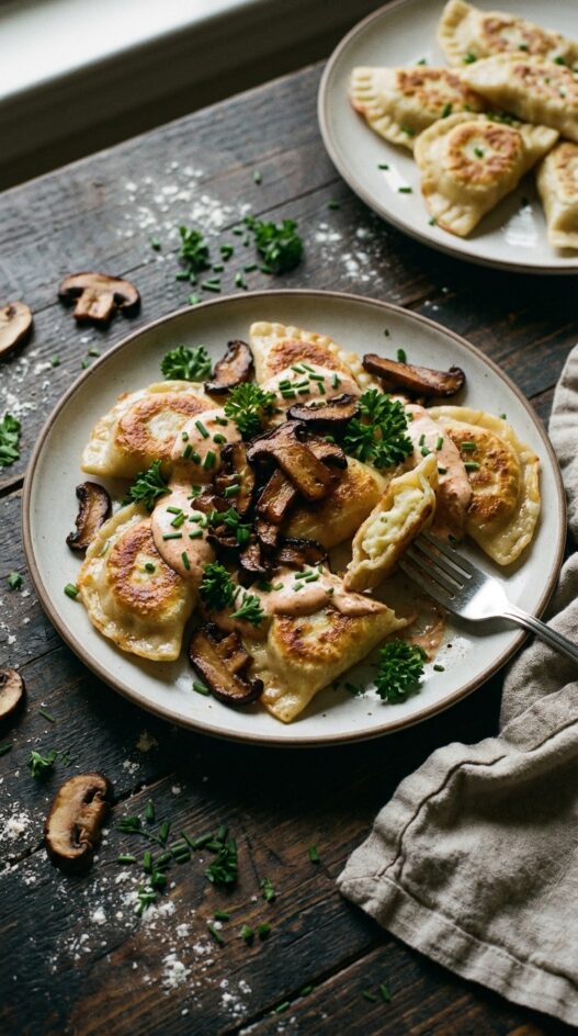 Loaded Potato Pierogis with Bacon Mushrooms