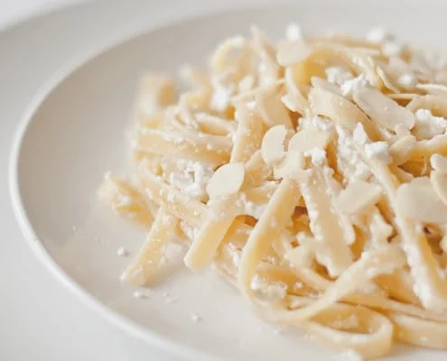 A summery pasta dish with creamy buffalo ricotta, zesty lemon, and crunchy almonds, all enveloped in al dente linguine. Perfect for a light and refreshing meal.