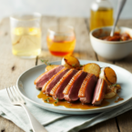 Crispy duck breasts are bathed in a sweet-tart orange sauce. Served with honey-caramelized turnips for a delightful contrast.