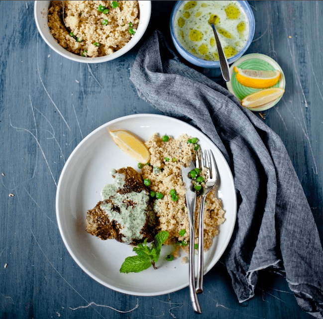 Dukkah-Crusted Lamb Chop with Yogurt Mint Sauce and Pea Couscous
