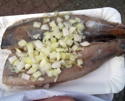 Maatjesharing is prepared in a specific way. It is “gekaakt” (the process of gibbing), in which the gills and intestines are removed, but the pancreas is left. The pancreas excretes specific enzymes that will help the herring to ‘mature’, which is very important for the taste. Then the herring is salted, often for about 5 days. The herring has been frozen before salting for at least 24 hours at at least -45C to kill possible parasites. After salting it is filleted in a specific way: the head is removed, as are all the bones and the skin, but the tail is left on. The tail is often used as a handle to hold the fish when lowering it into your mouth. New herring can be eaten with or without onions, and sometimes it is eaten with pickles or on bread. It has a soft texture, tastes lightly salty and ripened, and smells fresh. It is usually bought at a market stand and eaten there as a snack, but can also be bought at fishmongers and supermarkets. Foreigners (and even some Netherlanders) often think that this is a weird habit, eating raw fish, but actually the fish is cooked by the salting. If you think eating herring from the tail is a bit to adventurous, the herring salad I give the recipe for is a very nice alternative for eating herring!