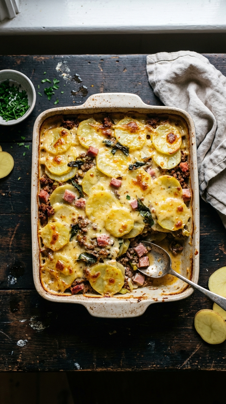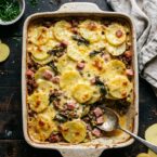 Hearty potato and leek bake topped with a creamy cheese and ham sauce. Comfort food at its finest!