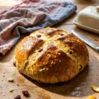 Pinca is a sweet enriched dough scented with lemon and orange zest, and my version folds in dried cranberries soaked in fresh orange juice. The crumb is soft and slightly brioche-like. It tears apart easily. I score a cross into the top before baking, which is traditional, and brush the surface with egg wash so it comes out a deep golden brown. It takes patience, about two hours from start to oven, but the actual hands-on work is short.