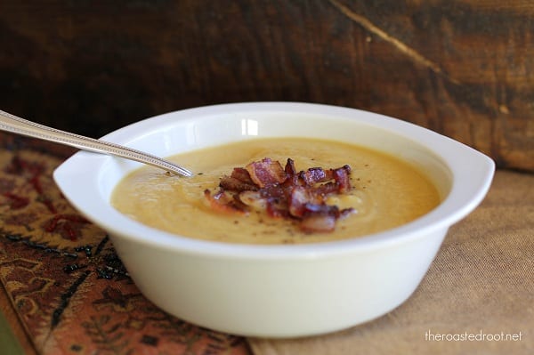 - If desired, chop 3 strips of bacon and cook them over medium heat until they crisp up. Serve soup with crisped bacon on top or skip the bacon to make this vegetarian.