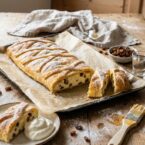 - Brush the strudel with a beaten egg, decorate with the remaining strips of dough if you wish, and bake until a light golden brown, about 40 minutes. Allow to cool.